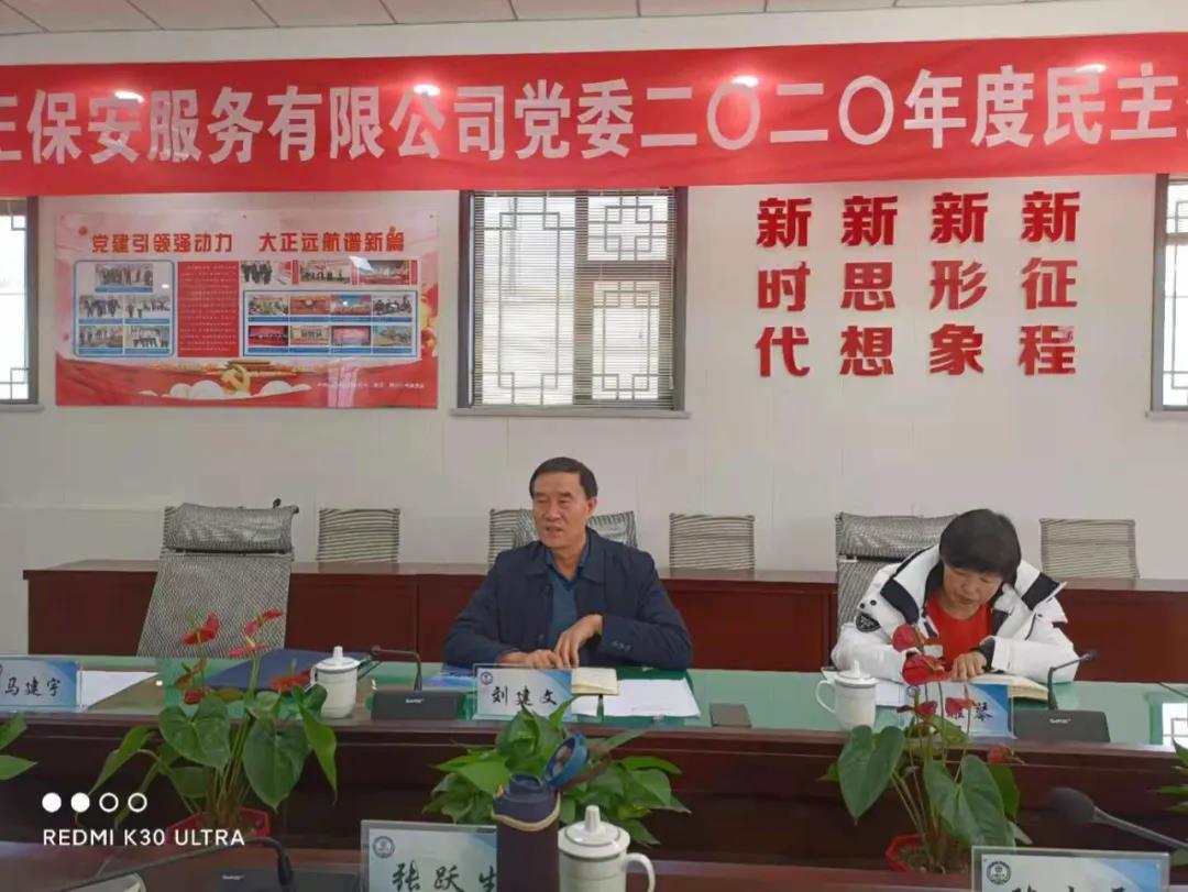 按照市委及市工信局(國(guó)資委)黨委安排部署,2021年1月29日下午,山西大正保安服務(wù)有限公司黨委召開(kāi)2020年度黨員領(lǐng)導(dǎo)干部民主生活會(huì)。市工信局(國(guó)資委)黨委委員、二級(jí)調(diào)研員劉建文同志等市工信局(國(guó)資委)指導(dǎo)組同志到會(huì)指導(dǎo)。公司黨委書(shū)記、董事長(zhǎng)張躍生同志主持會(huì)議。公司黨委副書(shū)記、總經(jīng)理趙培宏同志,黨委副書(shū)記、副總經(jīng)理陳志平同志,黨委委員、副總經(jīng)理王明生同志,黨委委員、總經(jīng)理助理邢春生同志,董事、副總經(jīng)理張瑞東同志,董事、財(cái)務(wù)總監(jiān)呂雙明同志參加會(huì)議,辦公室、黨群工作部負(fù)責(zé)人列席會(huì)議。