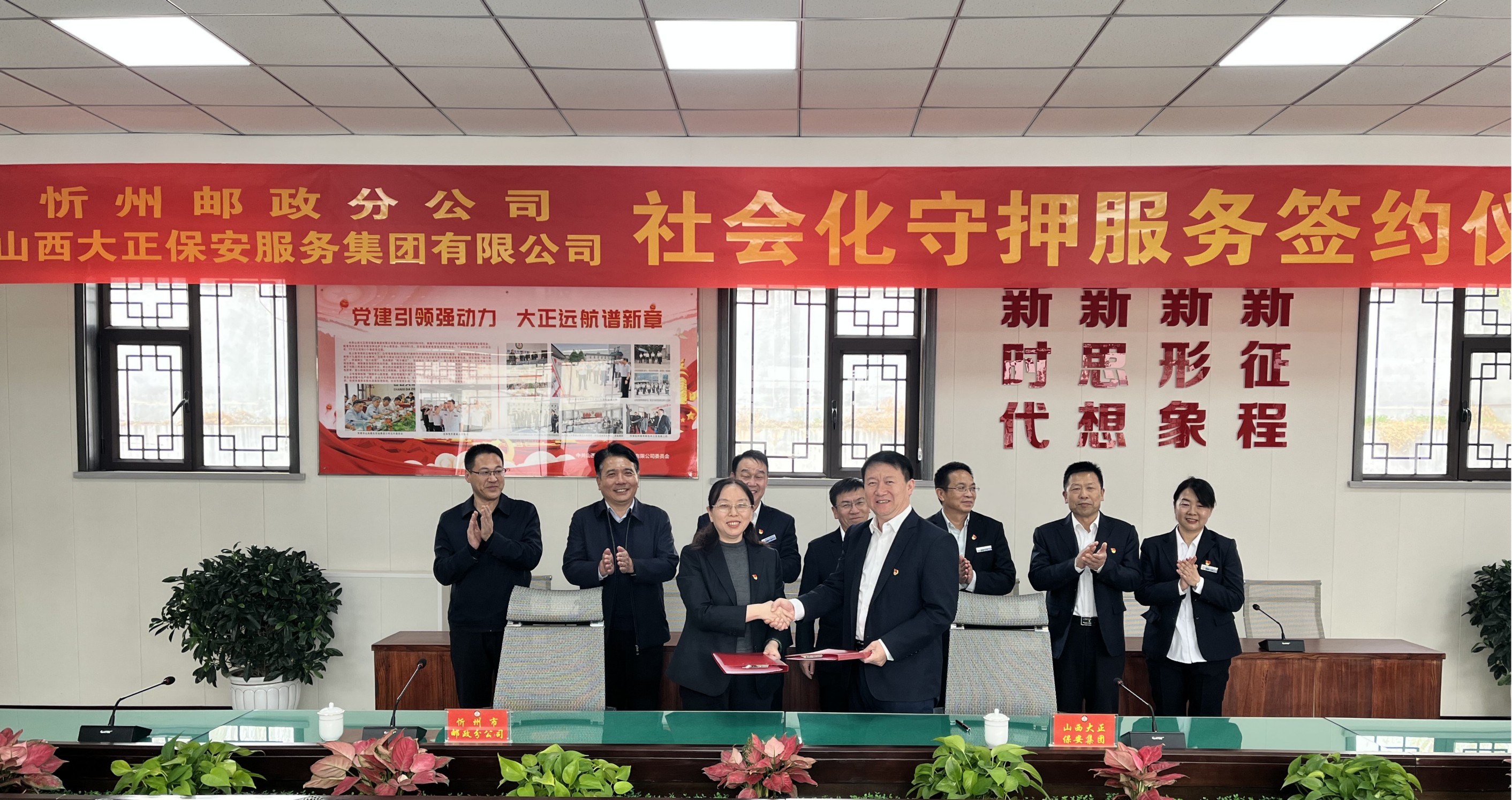 中國(guó)郵政集團(tuán)忻州市分公司黨委委員、副總經(jīng)理高茂懷,安保部主任李靜宇;山西大正保安集團(tuán)黨委委員邢春生,董事、正大物業(yè)公司總經(jīng)理呂雙明,總經(jīng)理助理羅鵬生、宋林兔,守押綜合部主任韓美芳出席簽約儀式。