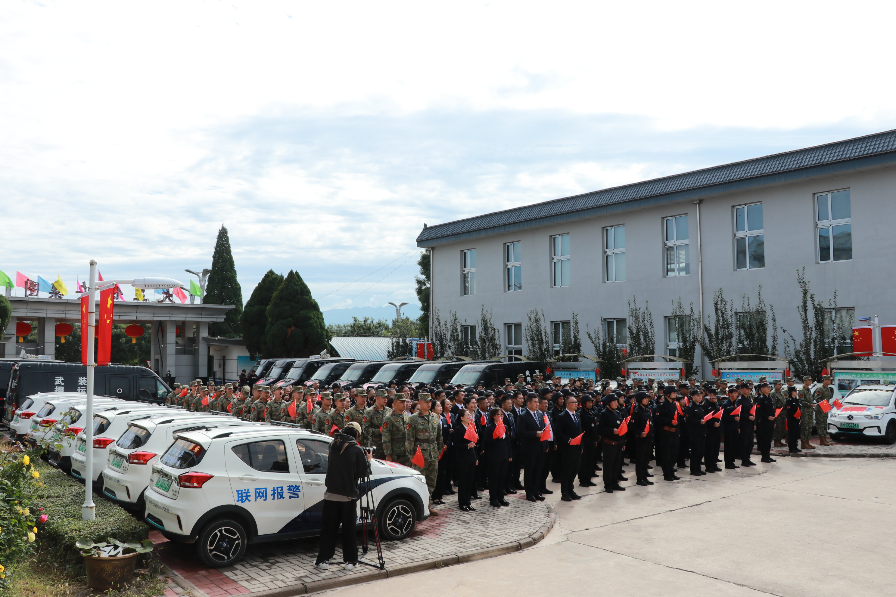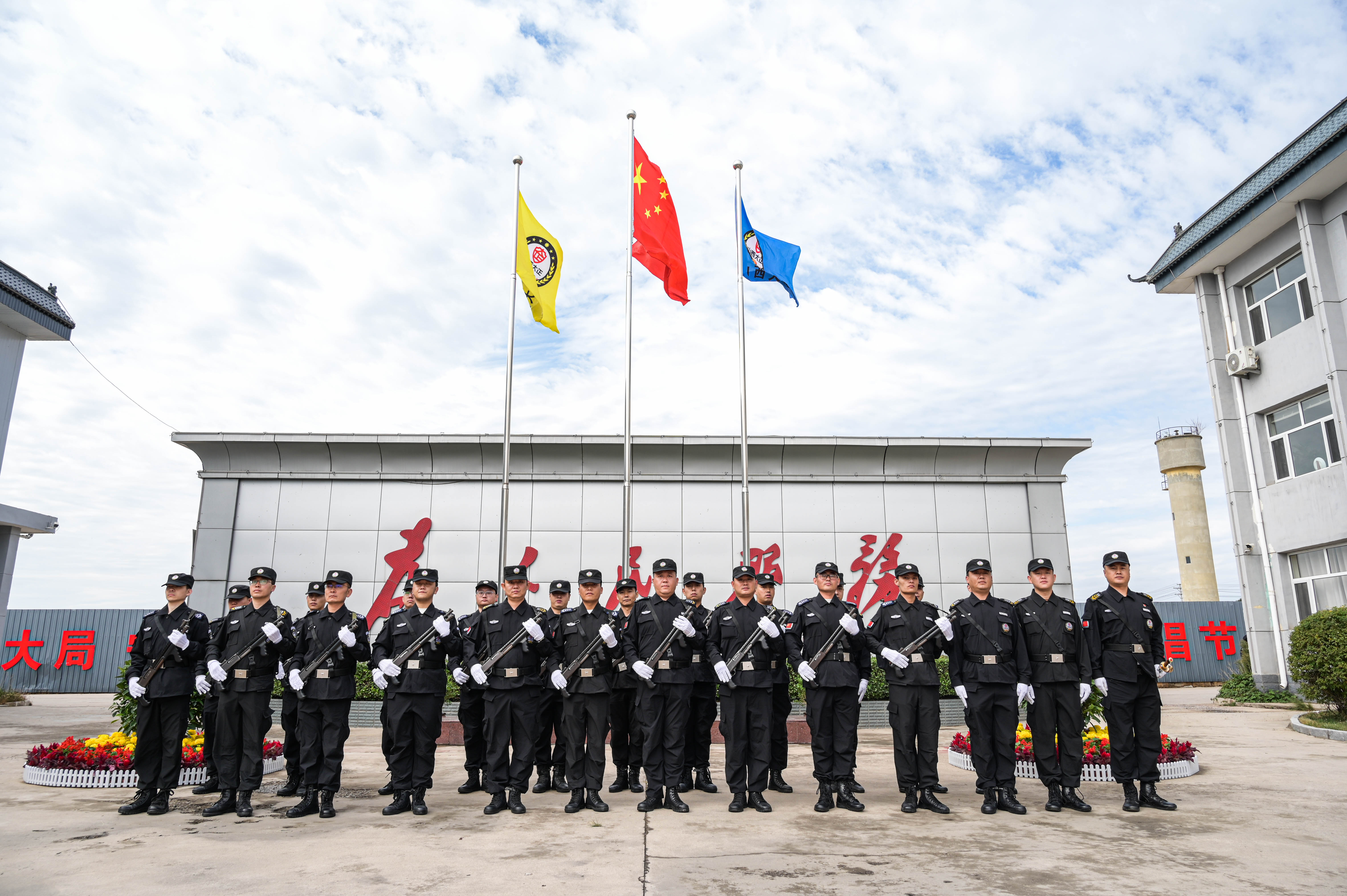 節(jié)日的公司院內(nèi)外,四周花團(tuán)錦簇,大門口燈籠高掛、彩旗飄揚(yáng),為節(jié)日增添了濃厚的喜慶氛圍。公司運(yùn)鈔車、巡邏車、運(yùn)兵車干凈整潔,排列在場地兩側(cè),升旗儀式更顯隆重。9時(shí)30分,集團(tuán)公司、各子公司領(lǐng)導(dǎo)和機(jī)關(guān)各部門、城區(qū)員工共300多人整齊列隊(duì),懷著激動的心情,手持小國旗,臉上貼著愛國貼紙、洋溢幸福的笑容,眼神中充滿了對祖國的熱愛和對升旗儀式的期待。