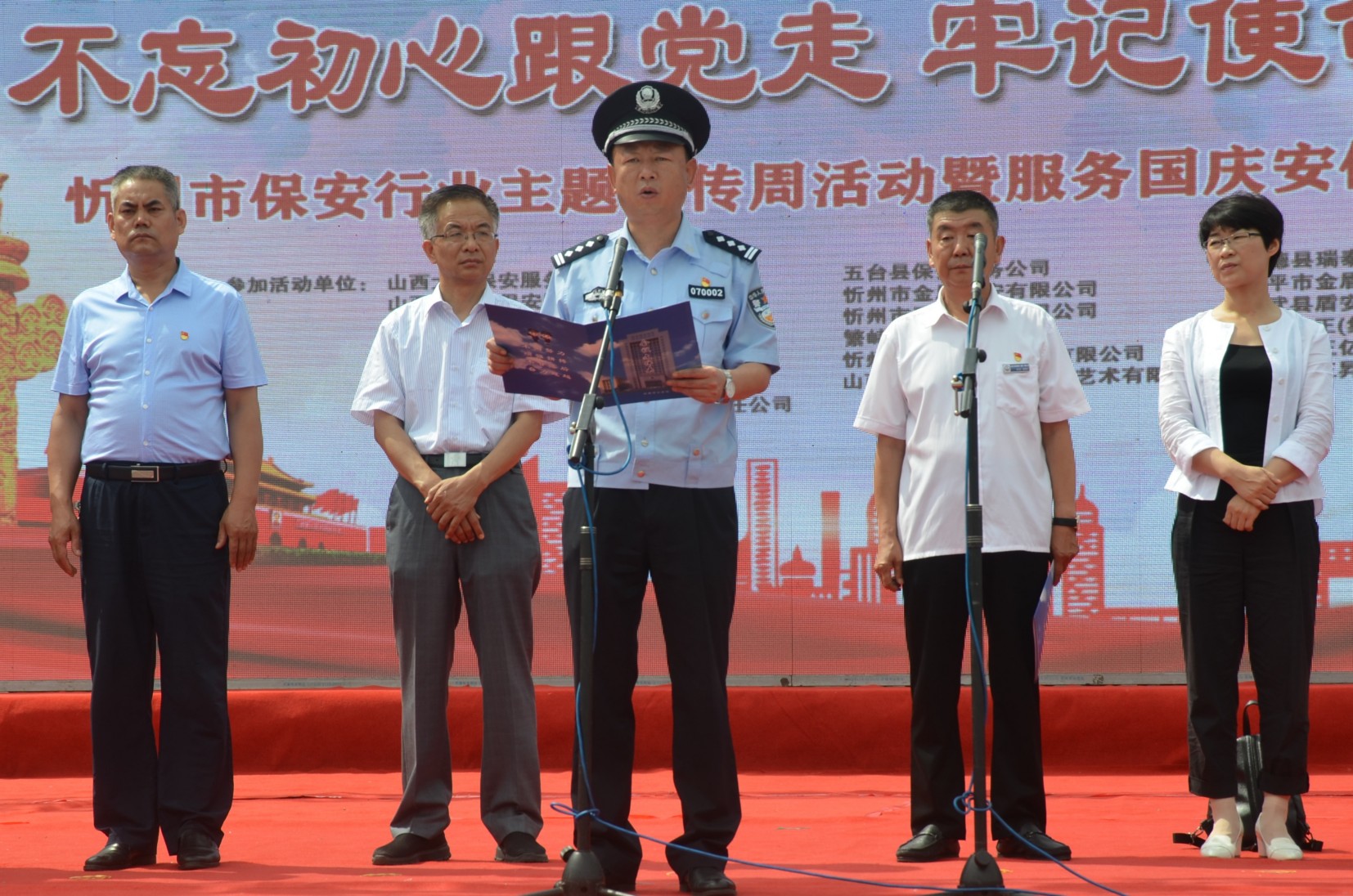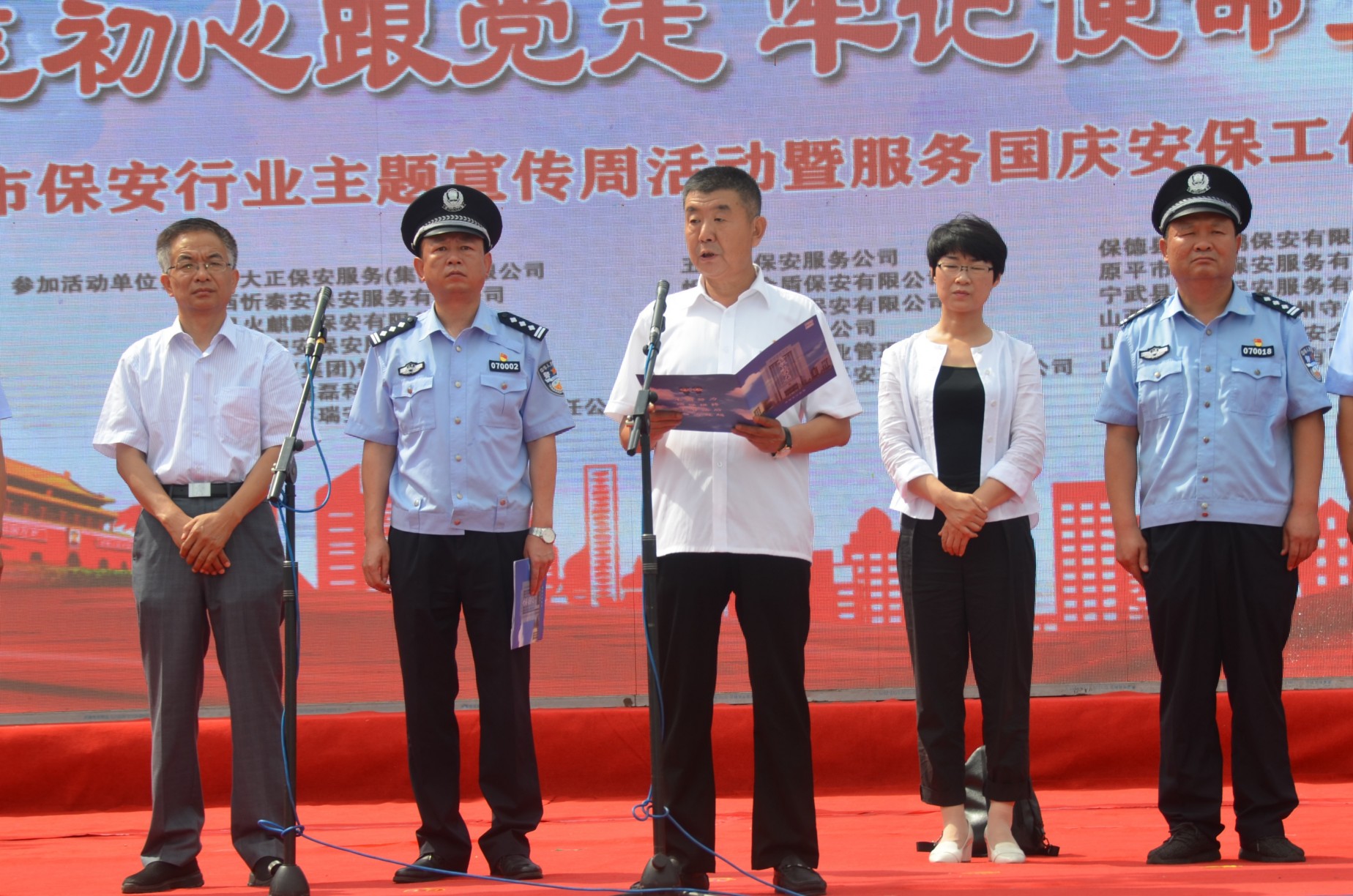 市總工會常務(wù)副主席王書鴻,市婦聯(lián)辦公室主任王軼男,市人社局保險科科長溫秀偉,市公安局治安支隊負(fù)責(zé)人王新策,市公安局直屬分局局長楊德華,市公安局忻府分局局長張鵬,市公安局直屬分局副局長劉建強出席儀式。市保安協(xié)會副會長、山西大正保安服務(wù)有限公司黨委委員、副總經(jīng)理趙培宏主持儀式并宣布主題宣傳周活動正式啟動。市保安協(xié)會副會長、山西大正保安服務(wù)有限公司黨委委員、副總經(jīng)理王明生出席儀式并宣讀主題宣傳周活動實施方案。全市18家保安企業(yè)負(fù)責(zé)人、保安隊員代表500余人參加儀式。在忻參加全省守押行業(yè)素質(zhì)提升在崗輪訓(xùn)的各地市守押企業(yè)隊員100余人應(yīng)邀參加儀式。