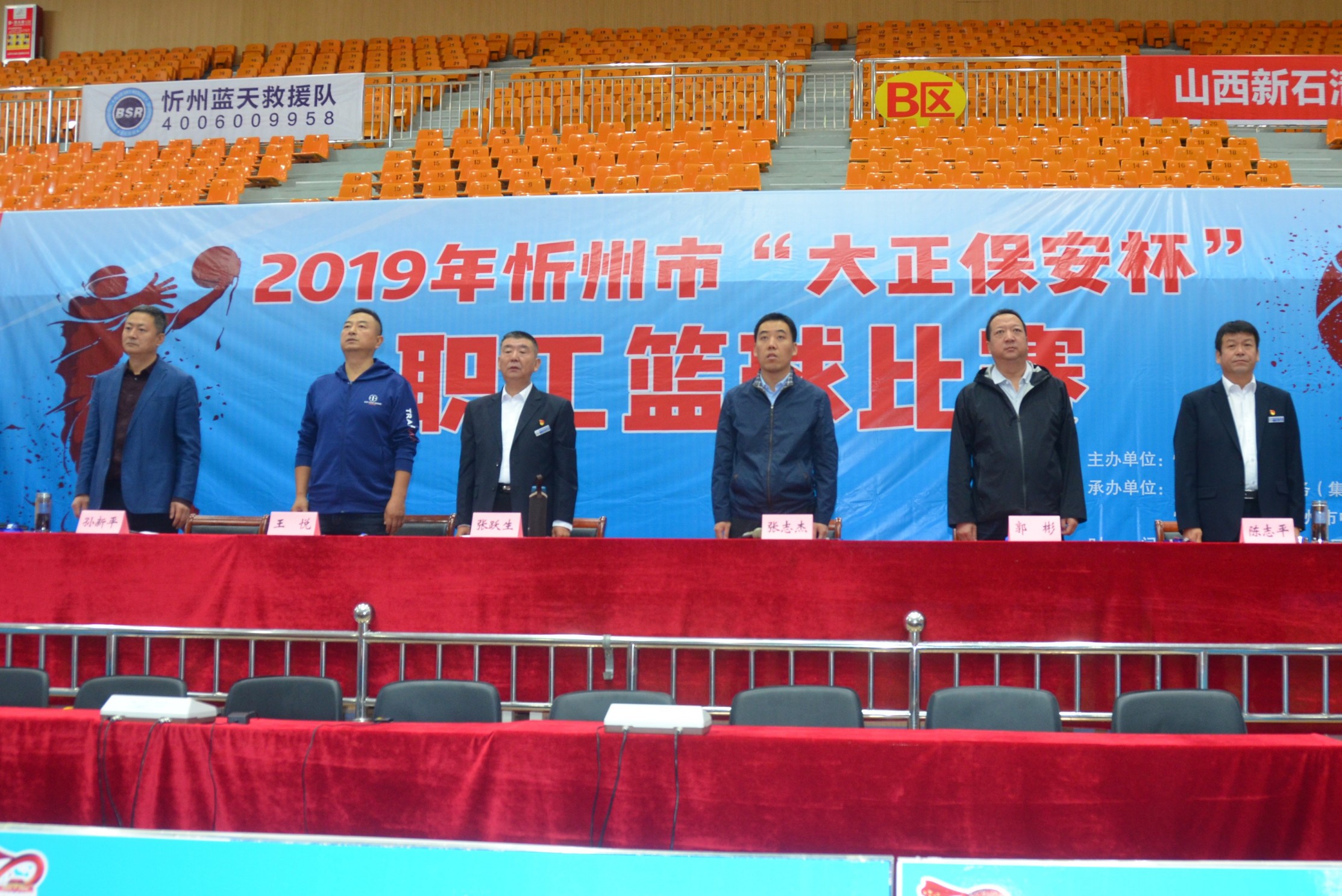 市體育局局長張志杰出席儀式并宣布2019年忻州市“大正保安杯”職工籃球賽開幕,集團(tuán)公司黨委書記、董事長張躍生、市體育局副局長郭彬、集團(tuán)公司黨委副書記、副總經(jīng)理陳志平、市文旅局副調(diào)研員孫新平等領(lǐng)導(dǎo)出席儀式,市體育局副局長王悅主持儀式。參賽代表隊(duì)、社會(huì)各界群眾代表及集團(tuán)公司所屬各分公司員工500余人參加儀式。