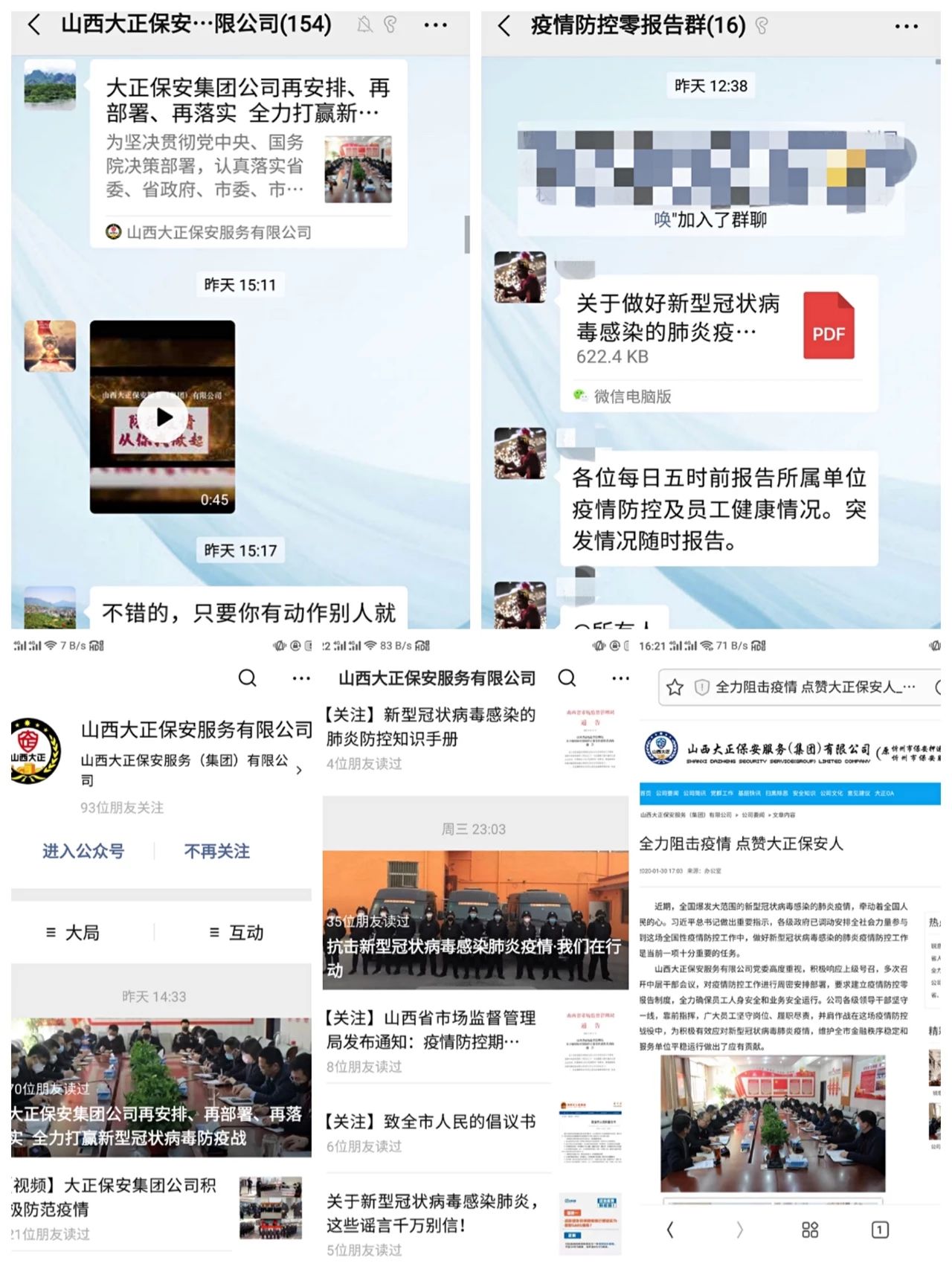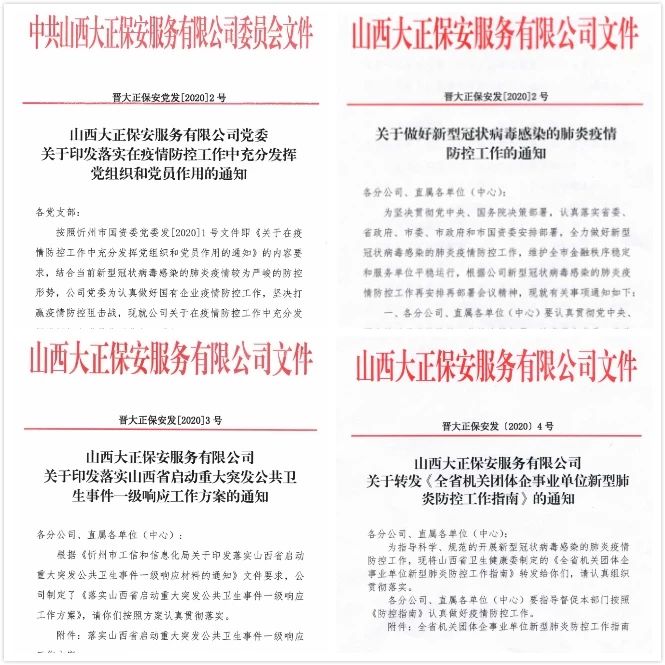 為深入貫徹習(xí)近平總書記對(duì)新型冠狀病毒感染肺炎疫情防控工作的重要指示精神,堅(jiān)決落實(shí)黨中央重大決策部署及省委、市委、市國資委部署安排,山西大正保安服務(wù)(集團(tuán))有限公司印發(fā)《關(guān)于做好新型冠狀病毒感染的肺炎疫情防控工作的通知》、《山西大正保安服務(wù)有限公司關(guān)于印發(fā)落實(shí)山西省啟動(dòng)重大突發(fā)公共衛(wèi)生事件一級(jí)響應(yīng)工作方案的通知》,要求公司各部門把防控疫情作為當(dāng)前最重要的工作來抓,落實(shí)落細(xì)防控措施,切實(shí)保障員工安全,保障全市金融秩序穩(wěn)定和服務(wù)單位平穩(wěn)運(yùn)行。集團(tuán)公司黨委印發(fā)了落實(shí)在疫情防控工作中充分發(fā)揮黨組織和黨員作用的通知,要求基層黨支部、全體黨員深刻認(rèn)識(shí)疫情防控形勢,全面落實(shí)我市“五嚴(yán)五防”措施,用實(shí)際行動(dòng)踐行初心使命。