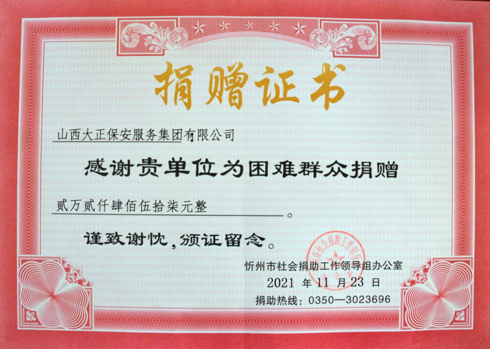 與此同時,公司基層各級黨組織和黨員領(lǐng)導(dǎo)干部充分發(fā)揮表率作用,帶頭宣傳動員,帶頭捐款獻(xiàn)愛心,以實(shí)際行動影響和帶動廣大干部職工在各所屬駐地相繼踴躍開展、參與了捐助活動。一筆筆捐款,代表著山西大正保安集團(tuán)廣大職工的一份份愛心,詮釋著大正保安人對社會的拳拳愛心,短短幾天時間,我公司共收到員工社會捐款22457元。