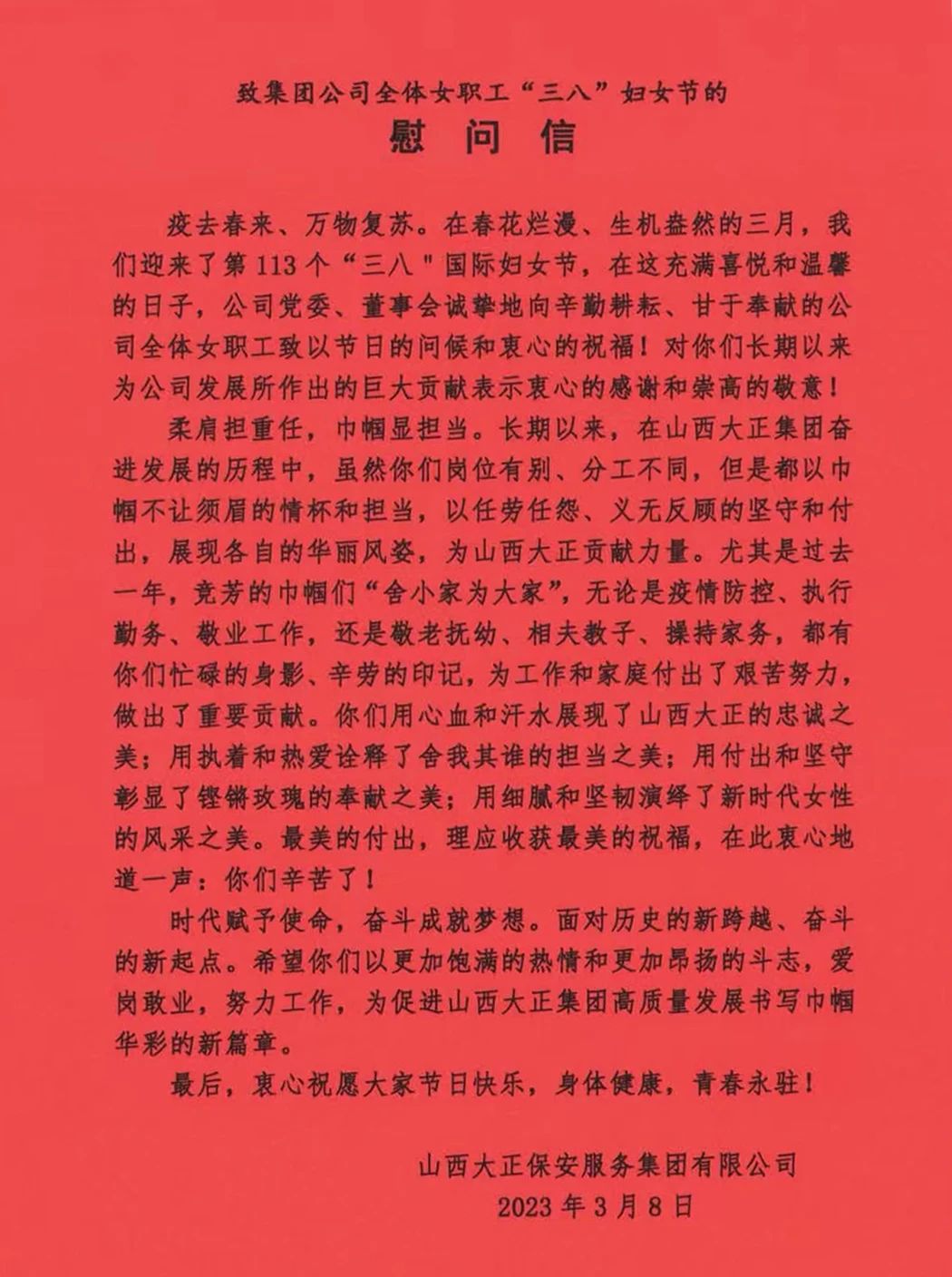 在第113個(gè)國際婦女節(jié)也是我國第100個(gè)婦女節(jié)到來之際,山西大正保安服務(wù)集團(tuán)有限公司向公司所有女同胞們致以節(jié)日的問候和美好的祝愿!向所有辛勤耕耘、默默奉獻(xiàn)在大正各個(gè)崗位上的姐妹們表示親切的問候、崇高的敬意!