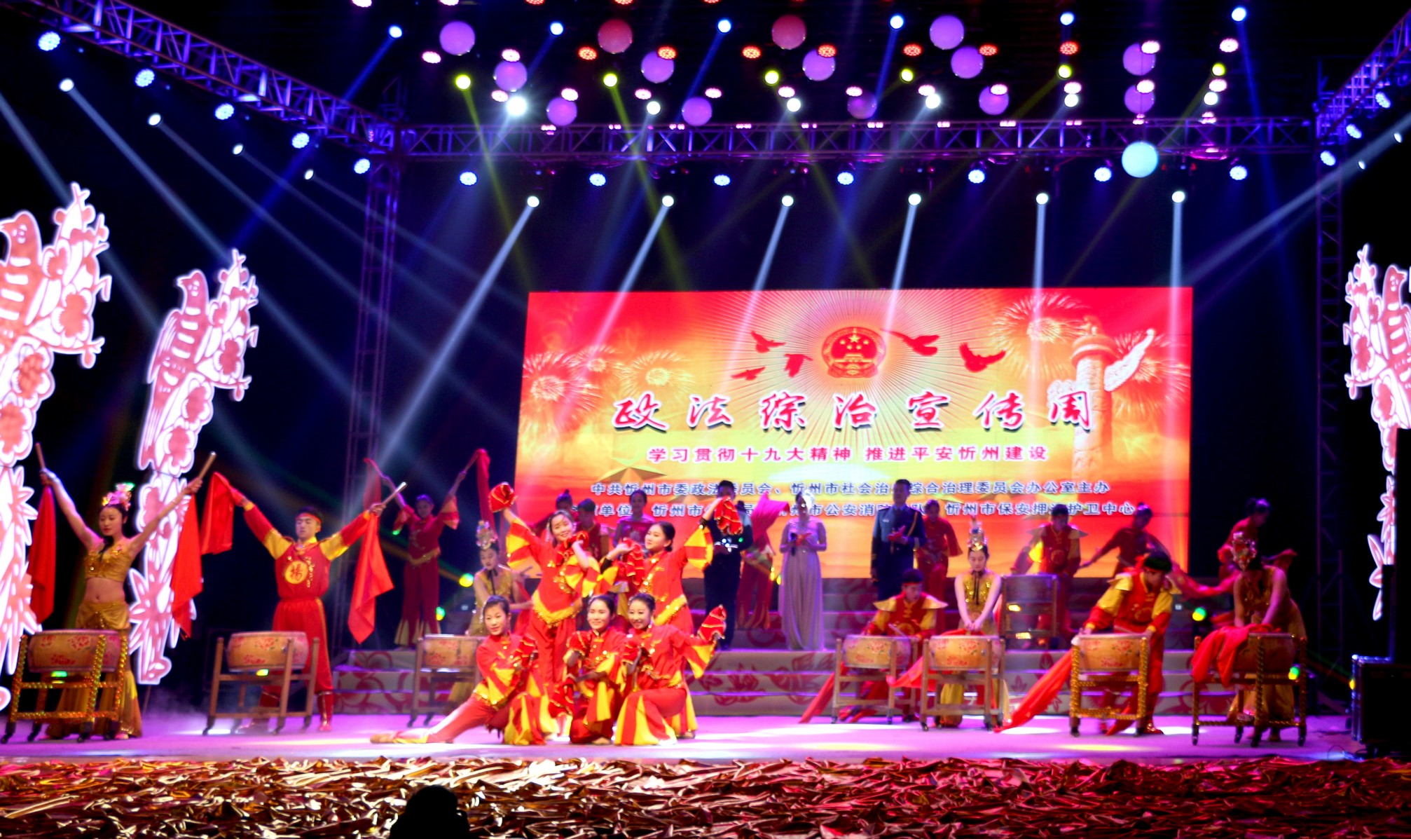 晚會以“學(xué)習(xí)貫徹十九大精神,推進平安忻州建設(shè)”為主題,歌頌了忻州市在平安建設(shè)中取得的卓越成績和政法綜治戰(zhàn)線干部的無私奉獻精神。晚會節(jié)目精彩紛呈,“牽手平安”藝術(shù)團表演的《鼓舞中華》、男女對唱《幸福贊歌》、小合唱《強軍戰(zhàn)歌》、歌伴舞《建設(shè)和諧大家園》等節(jié)目獲得了觀眾陣陣掌聲。