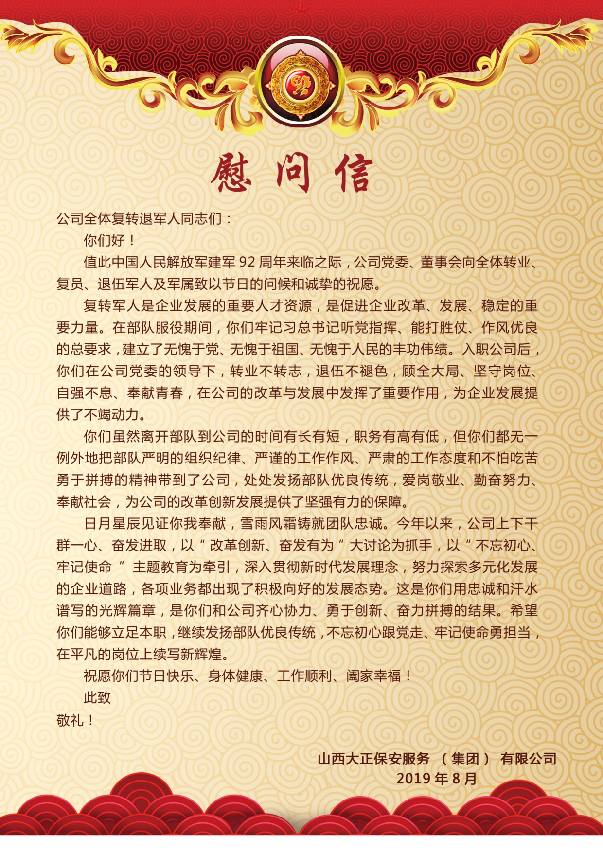 黨委委員、副總經(jīng)理趙培宏宣讀《慰問信》,信中談到:公司的每位復(fù)轉(zhuǎn)軍人都是企業(yè)發(fā)展的重要人才資源,是促進(jìn)企業(yè)改革、發(fā)展、穩(wěn)定的重要力量,處處發(fā)揚(yáng)著部隊優(yōu)良傳統(tǒng),為公司的改革創(chuàng)新發(fā)展提供了堅強(qiáng)有力的保障。希望大家能夠以“改革創(chuàng)新、奮發(fā)有為”大討論為抓手,以“不忘初心、牢記使命”主題教育為牽引,立足本職,發(fā)揚(yáng)部隊優(yōu)良傳統(tǒng),不忘初心跟黨走、牢記使命勇?lián)?dāng),在平凡的崗位上續(xù)寫新輝煌。