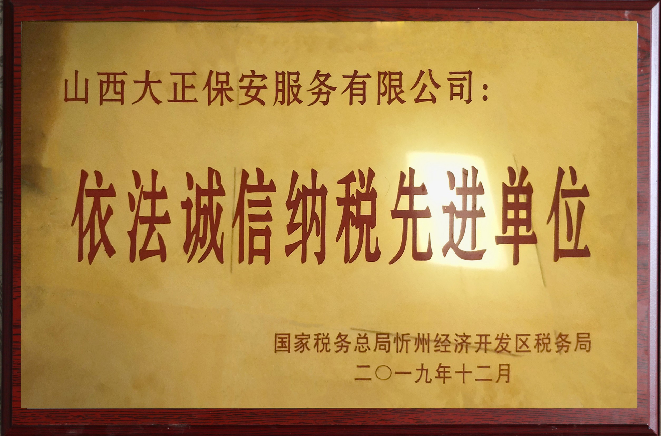 12月15日,國家稅務(wù)總局忻州經(jīng)濟(jì)開發(fā)區(qū)稅務(wù)局舉行2019年度“依法誠信納稅先進(jìn)單位”頒獎(jiǎng)儀式。山西大正保安服務(wù)(集團(tuán))有限公司等9家企業(yè)榮獲2019年度“依法誠信納稅先進(jìn)單位”稱號(hào)。集團(tuán)公司黨委委員、副總經(jīng)理趙培宏代表公司參加儀式并上臺(tái)領(lǐng)獎(jiǎng)。