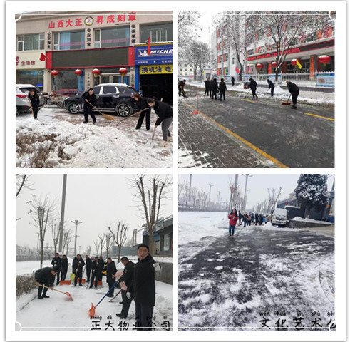 本次活動,利用1月6日—7日兩天時間,我公司組織全體員工清掃了位于開發(fā)區(qū)、七一南路、逯家莊、氣象北巷、通崗路等處城區(qū)駐地以及分布各縣的基層駐地的院內(nèi)積雪。我公司派駐各單位的保安、物業(yè)基層單位也積極行動,與服務單位的同志們一起清掃積雪,有力的保障了服務單位業(yè)務正常運行。同時,進一步延伸清掃范圍,將九原東街北同蒲鐵路線附近,利民西街北九巷附近,七一路小學及十一中兩所學校附近等處路面的積雪進行徹底清掃,為附近群眾出行提供了便利。