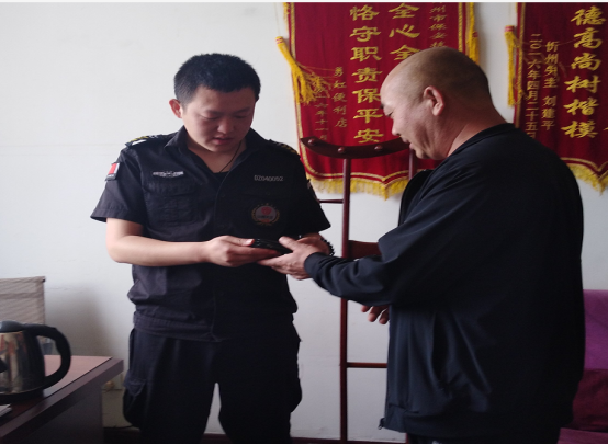 5月9日,山西大正億通保安安全技術(shù)公司巡邏隊(duì)隊(duì)員楊鑫磊、姜濤在開(kāi)展日常巡邏工作中,在某銀行發(fā)現(xiàn)一個(gè)黑色駕駛證本,里面裝有現(xiàn)金、證件及銀行卡。